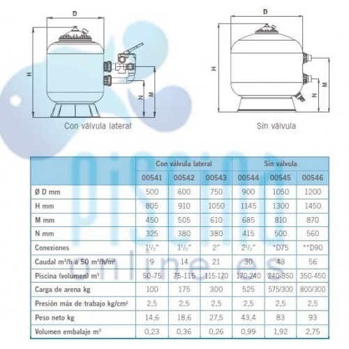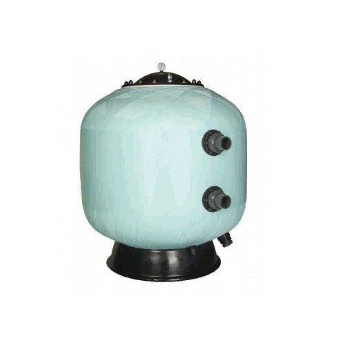 Acabado brillante satinado, con protección antipolvo por medio de un "flash" de barniz transparente de poliuretano. Tapa Ø 400 mm, inyectada. Equipado con purga de aire y agua manuales y manómetro y válvula selectora lateral. Velocidad máx. de filtración 50 m3/h/m2.