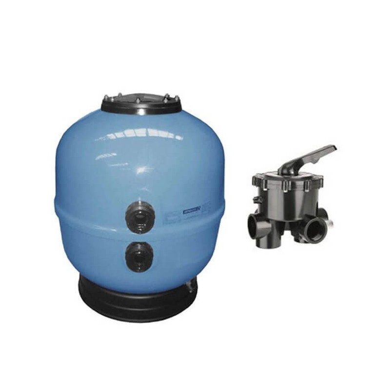 + Conexiones para válvula selectora de seis vías con operaciones de filtración, lavado, enjuague, recirculación, vaciado y cerrado.