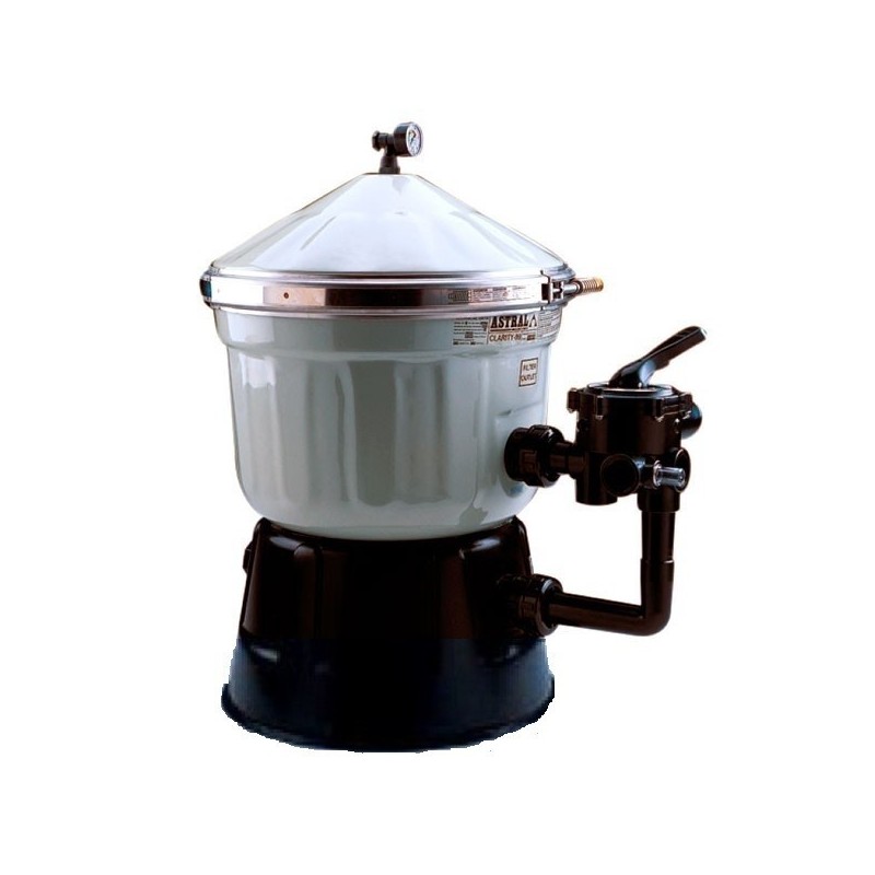 Filtros de diatomeas Clarity construidos en poliéster y fibra de vidrio. Equipados con manómetro, purga de aire y válvula selectora lateral. Carga de diatomeas no incluida. Velocidad de filtración 4,9 m3/h/m2. El código de la válvula de 1 1/2 " es 15385, el de 2" es 15389.