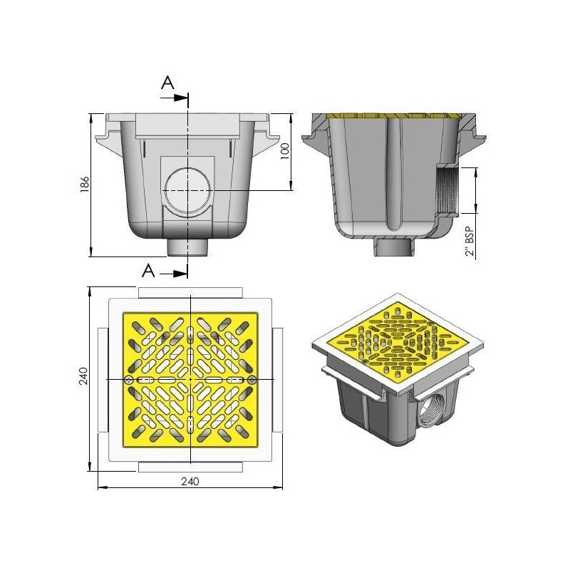 Sumidero con rejilla ABS cuadrado para piscinas de hormigón de 210 mm x 210 mm con la garantía de AstralPool. Cuerpo y rejilla, con fijación mediante tornillos, fabricado en ABS color blanco.