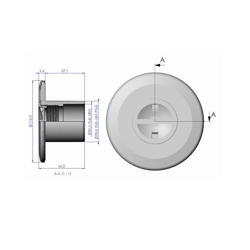Boquilla de aspiración en ABS color blanco para piscinas de hormigón para encolar a un tubo de 63 mm y 50 mm de diámetro que aguanta una presión máxima de 6 bar.