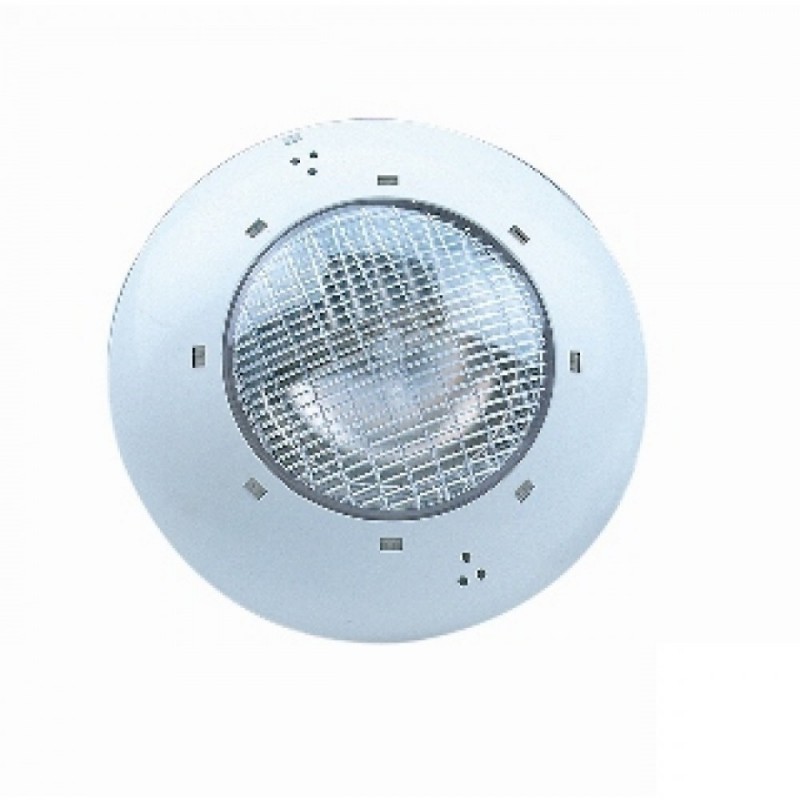 Construido en materiales plásticos inalterables y resistentes a la temperatura. Color blanco. No necesita nicho para su instalación. Disponible con embellecedor de plástico ABS o inox. Se fija a la pared mediante cruz de plástico reforzado, tacos y tornillos. Suministrado con 2,5 m de longitud de cable de 2 x 1,5 mm2. Lámpara halógena de 100 W y 12 V. Suministrado sin transformador.