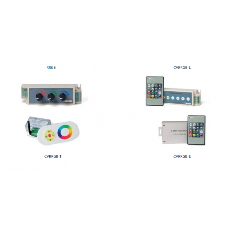 Controladores RGB manual o vía radio con múltiples funciones de selección de programa, velocidad y luminosidad. Salida PWM para control de dispositivos LED PWM de ánodo común.