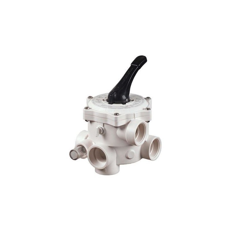 Válvula selectora con todas las entradas y salidas a rosca de 1 1/2". Además en la parte inferor dispone de 2 entradas para el enlace acodado, y un tapón para anular la que no se utilice.